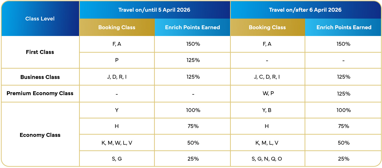 For example, if you travel a sector of 500 miles in Business Class (Class J) and the accrual % is 125%, you will earn 500 miles × 125% = 625 Enrich Points.